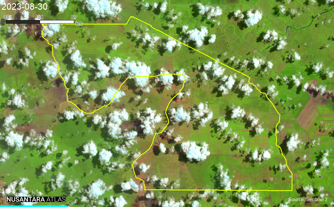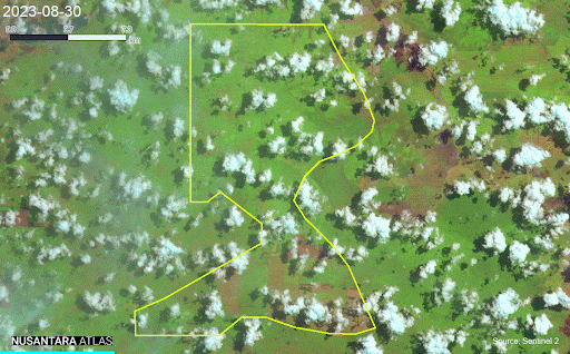 The timelapses below, developed on Nusantara Atlas/TreeMap show a time series of satellite images taken between August 30th – November 13th 2023. Using infrared color, fires and burned areas (dark brown) are clearly visible spreading across the plantation boundaries (yellow).