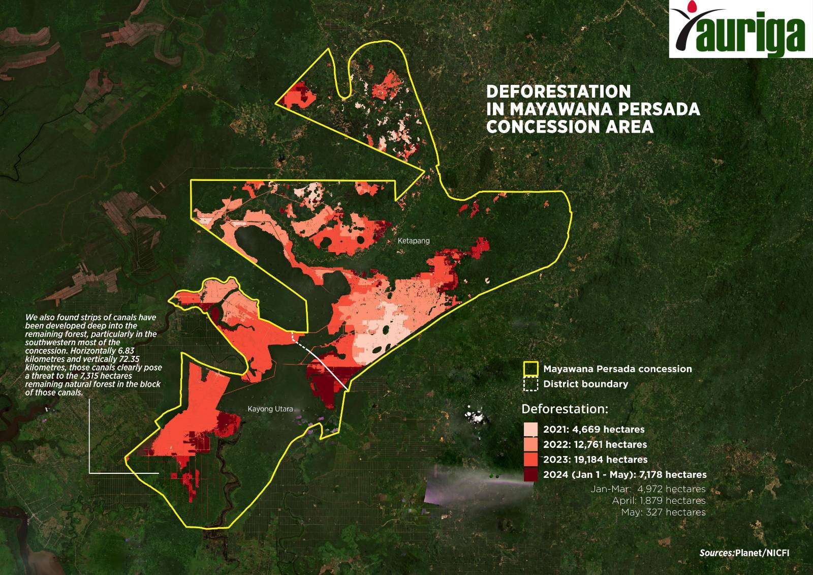 - Satellite analysis found that PT. Mayawana Persada, a pulpwood concession linked to the Royal Golden Eagle group, cleared 2,200 hectares (5,436 acres) of forested peatlands in April and May 2024.
