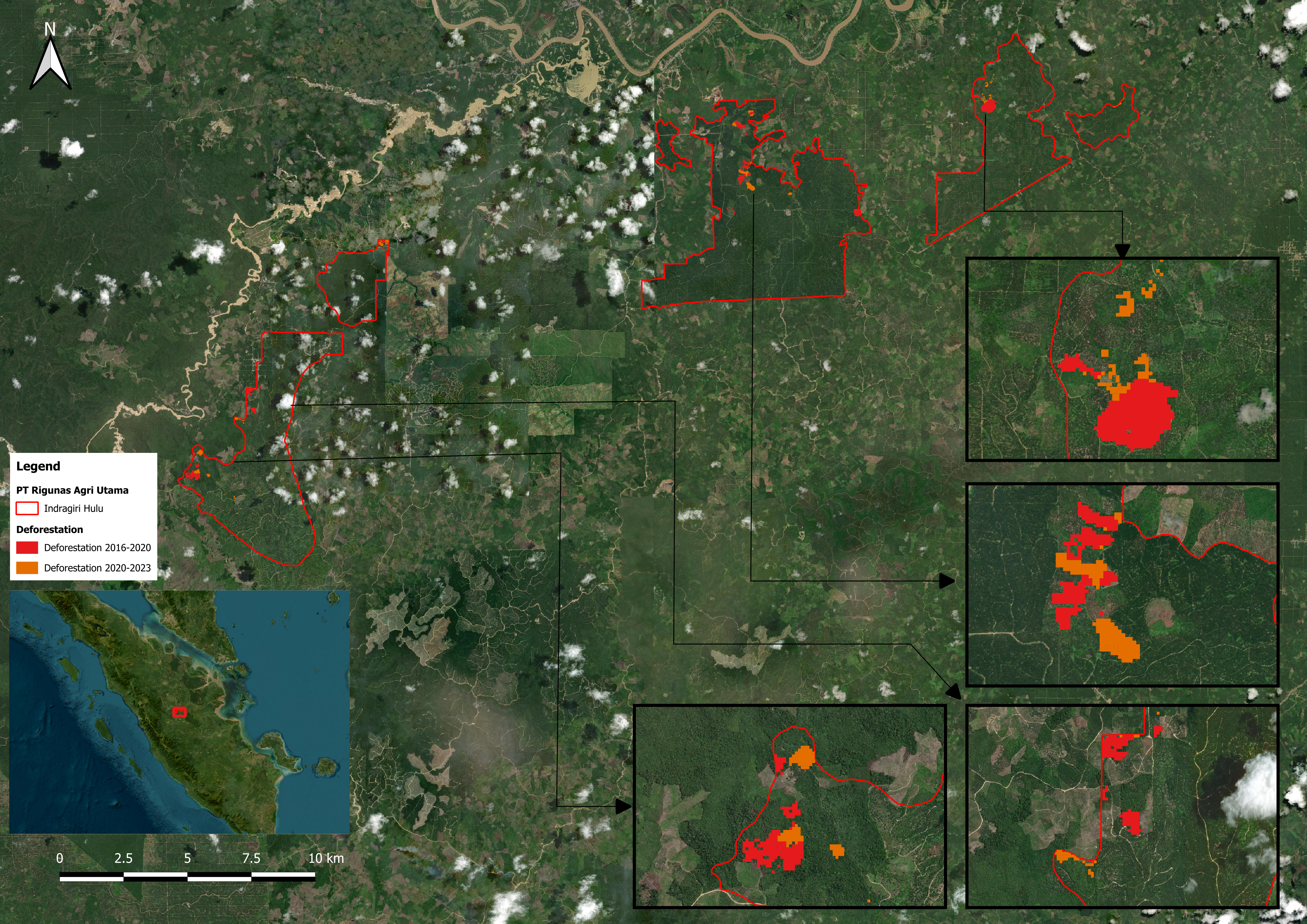 To monitor RGE’s performance on its no deforestation commitments, RAN commissioned satellite analysis of natural forest loss within 16 palm oil concessions connected to Asian Agri from 2016-2023 (for methodology, see below). RGE confirmed that 14 of these are its plantations but claims that two are suppliers to its palm oil trading arm Apical. For more details on RGE’s response, see the full report here.