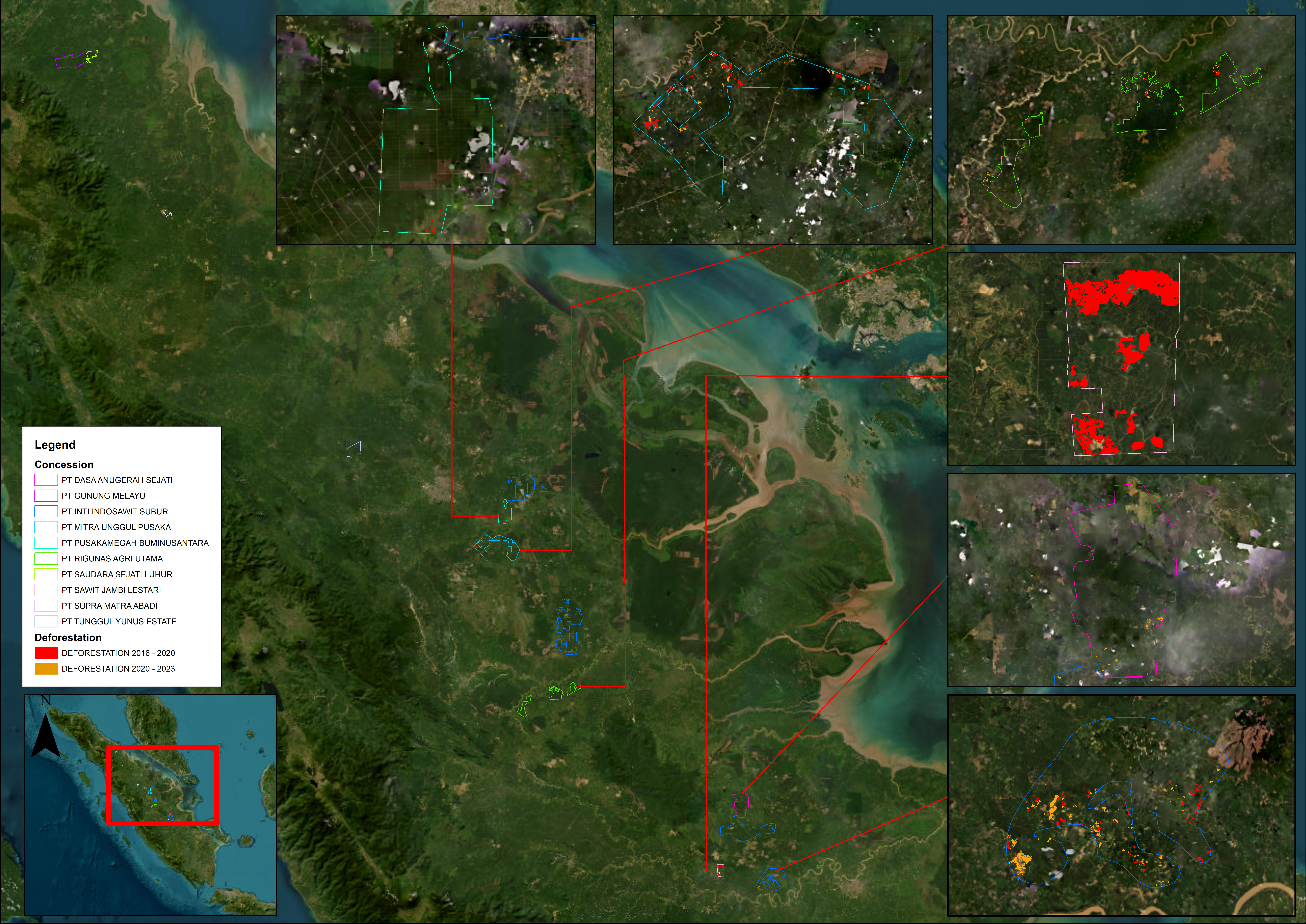 The maps shown in the gallery below shows where forests have been cleared within Asian Agri’s palm oil concessions and the concessions of two suppliers to Apical, between 2016 and 2023.
