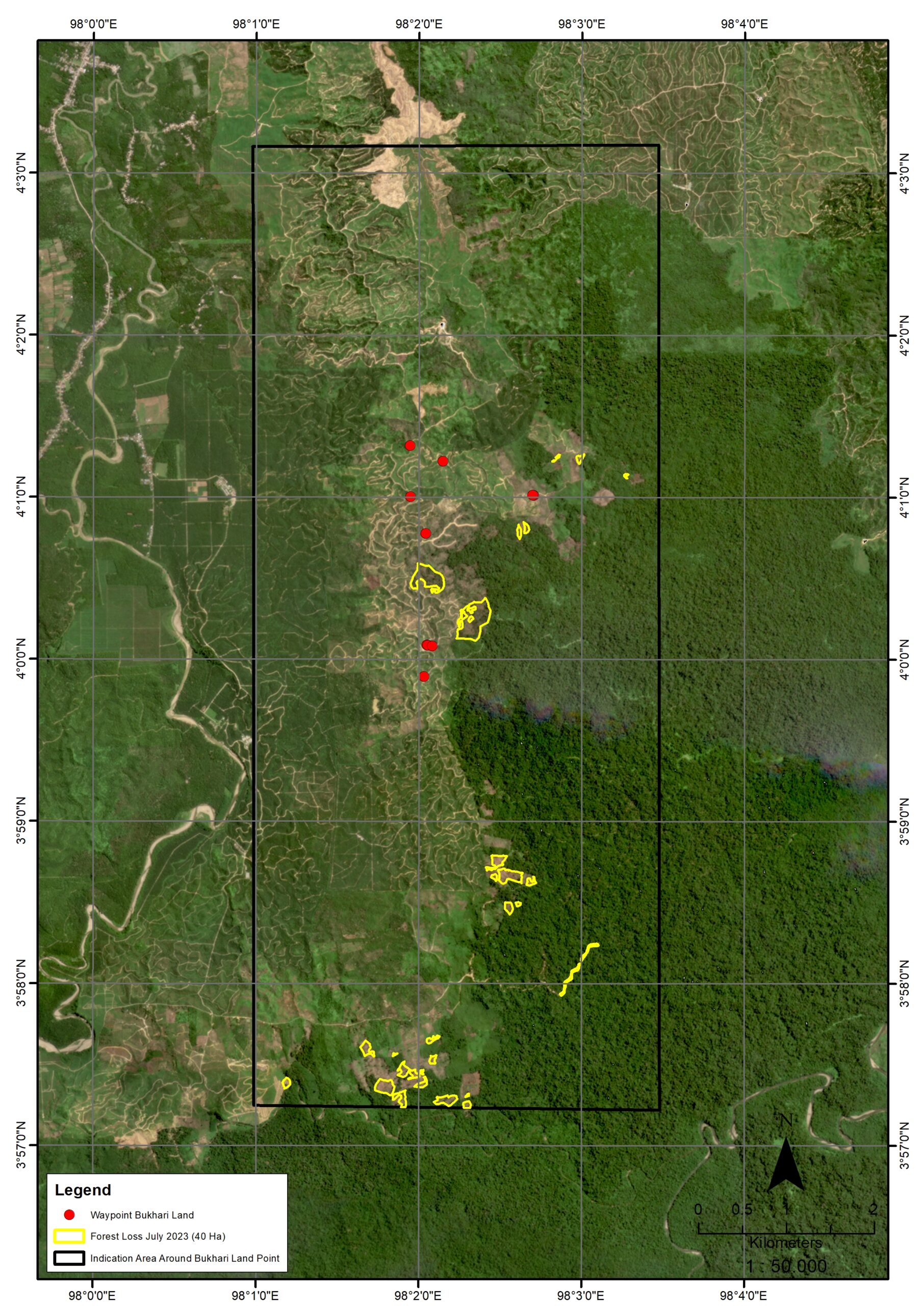 Satellite map showing forest loss in the indicative area of Mr. Bukhary’s palm oil plantation, July 2023