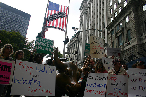 Onlookers cheered encouragement, adding to the strangely carnival-like atmosphere on Wall Street that has developed since tectonic shifts started rocking the financial sector. Perhaps because people are realizing that today’s crisis can be tomorrow’s opportunity – our financial system is collapsing and we now have an historic opportunity to start laying a foundation for a new, sustainable economy based on justice and fairness rather than corruption and greed.