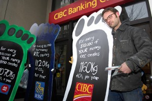We took to the streets of downtown Calgary (Banker’s Hall) on December 4th at lunch time so that we could meet the business and banking sector head-on. We went out with a banner and our giant footprints and walked busy Steven’s Avenue passing out information on how you could find out more information about your own banking carbon footprint at Climate Friendly Banking: Calculate Your Bank Account’s Carbon Footprint.