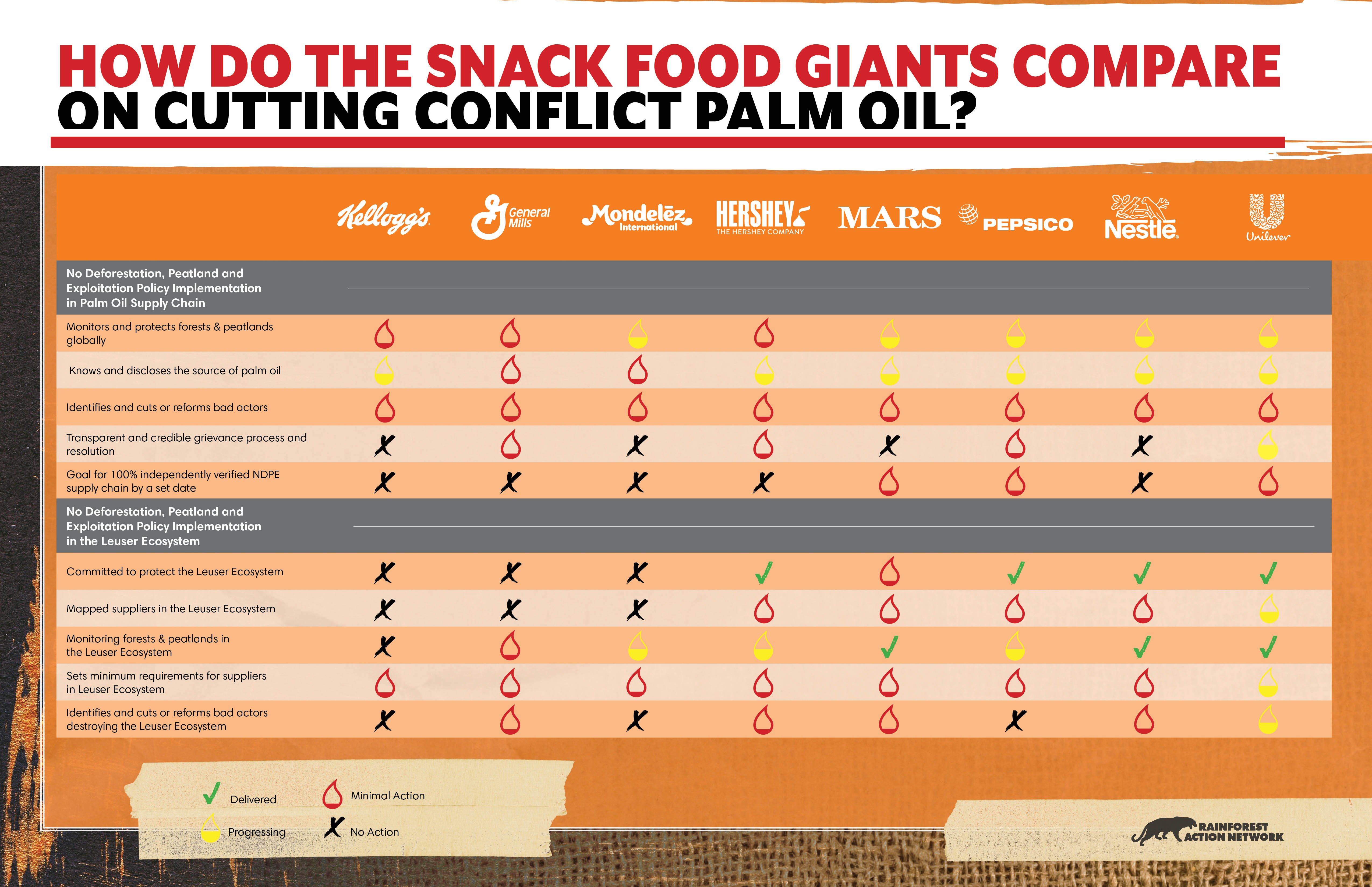 Thanks to the actions taken by folks like you, snack food companies have made policy promises to eliminate human rights abuses and forest destruction from their supply chains, and 2020 stands as a critical year to deliver on these promises. With 2020 upon us, we assessed major companies sourcing from the globally significant Leuser Ecosystem in Indonesia to determine if they have taken accountability — in the Leuser and across the globe —for the impact of their consumption of Conflict Palm Oil. Conflict Palm Oil is a highly controversial ingredient which, when produced irresponsibly, leads to rainforest destruction and development on peatlands, both significant contributors to the current climate crisis and to the exploitation of Indigenous Peoples, local communities and workers.
