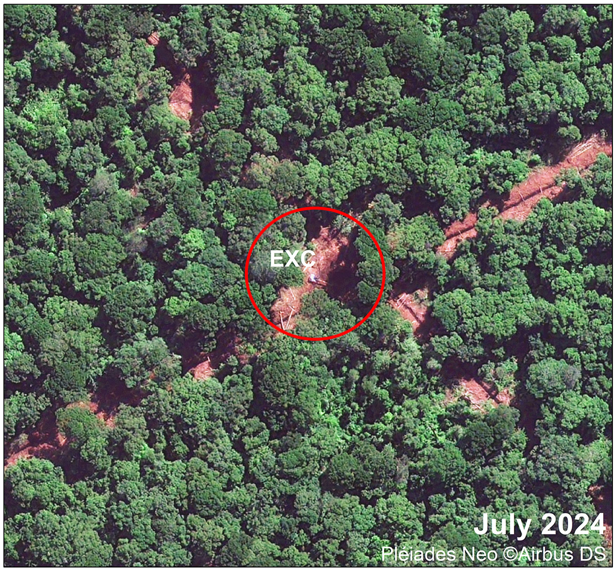 - Zooming in even more, the satellite captures an excavator next to an illegal canal. Excavators dig canals to drain peatlands, creating drier conditions for planting oil palms—a practice that releases high concentrations of trapped carbon dioxide into the atmosphere. Previous satellites could not achieve this level of resolution.