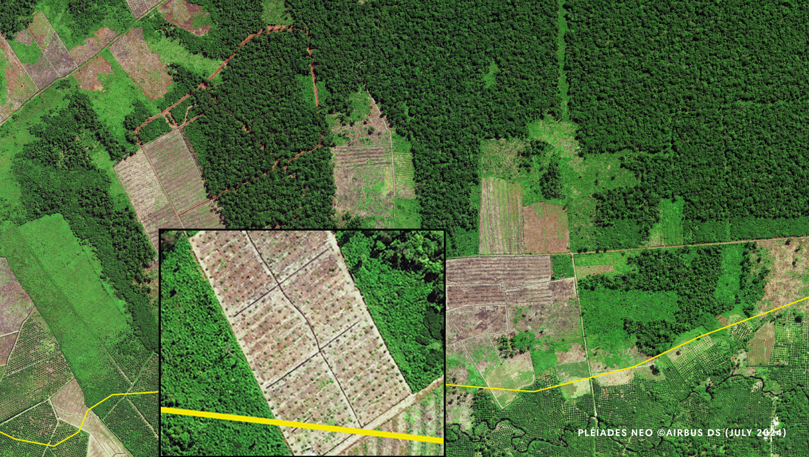 - The zoomed-in tile at the bottom of this image shows an oil palm plantation with an “open canopy,” meaning its oil palms are young, between .5 and 3 meters in diameter, and not yet producing fruit. We discovered 652 hectares of active oil palm plantations inside the reserve.