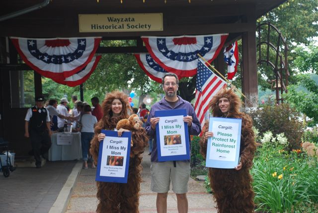 Four RAN activists, two dressed in orangutan costumes, spoke to hundreds of neighbors at a fourth of July celebration in Wayzata, Minnesota to call attention to Cargill’s role in rainforest destruction. Cargill, one of the world’s largest privately-held companies, is also the largest importer of palm oil in the U.S. Palm oil is the leading driver of rainforest destruction in Southeast Asia.