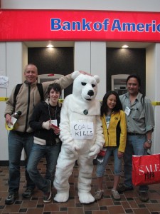 After a RAN-led non-violent direct action training, RAN activists—both ones who had been involved with RAN for years and who some who had discovered us at the Greenfest—decided to take on the global warming crime scenes that dotted Navy Pier. We were joined by a polar bear who was clearly concerned that the Bank of America was funding the coal that was leading to climate change and the destruction of his homeland.