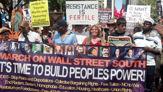 Nearly 2,000 protestors marched through the heart of Wall Street South, stopping to demand social, economic and environmental justice outside the headquarters of Bank of America and Duke Energy. In 92 degree heat, the pervasive mood was one of solidarity and unity in our demand for a better world.