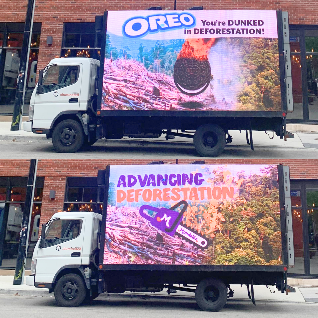 In the spirit of Mondelēz’ supply chains problems, we showed up to the conference with a billboard truck bearing the messages, “Mondelēz: Advancing Deforestation” and “Oreo: You’re dunked in deforestation.” Attendees were abuzz at the presence of the truck. Conference organizers promptly heightened security and canceled the planned Q&A session at the end. A Mondelēz executive opened the panel by remarking, “People like to say all kinds of things outside of our building.”