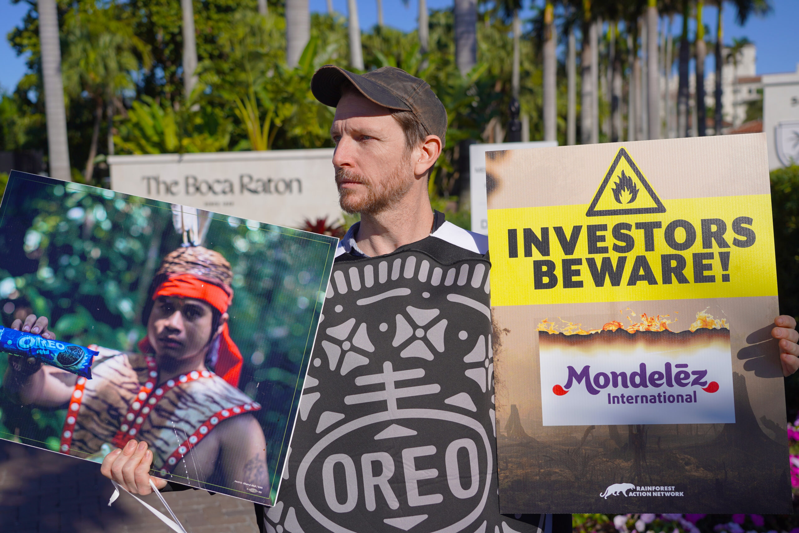 To underscore these points, we disseminated informational postcards during a presentation by one of the conference’s worst offenders, Mondelēz International, the maker of ubiquitous brands like Oreo and Ritz. Security escorted us out while we politely but loudly explained the risks to tropical forests associated with Mondelēz’ commodity sourcing to investors.